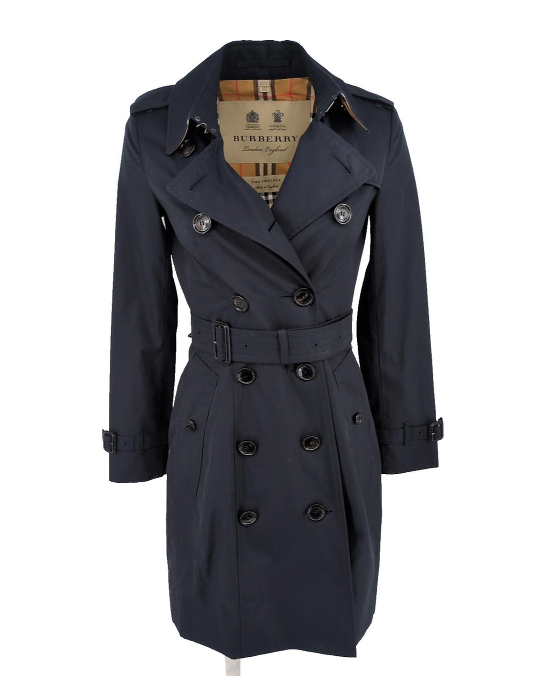 Burberry Chelsea Trench CoatMightnight NavyMid LengthBurberry embossed buttonsNova check interior lining2 external pocketsMade in EnglandGender...