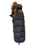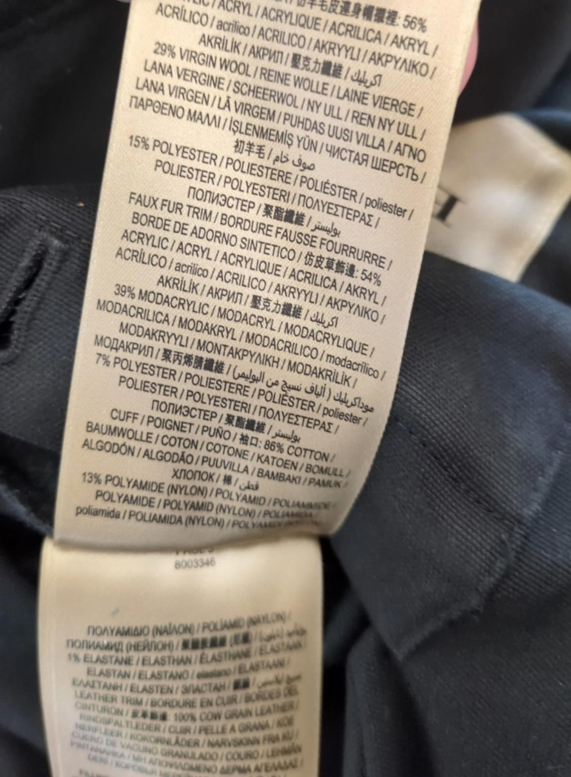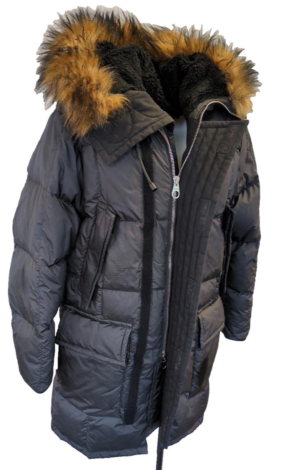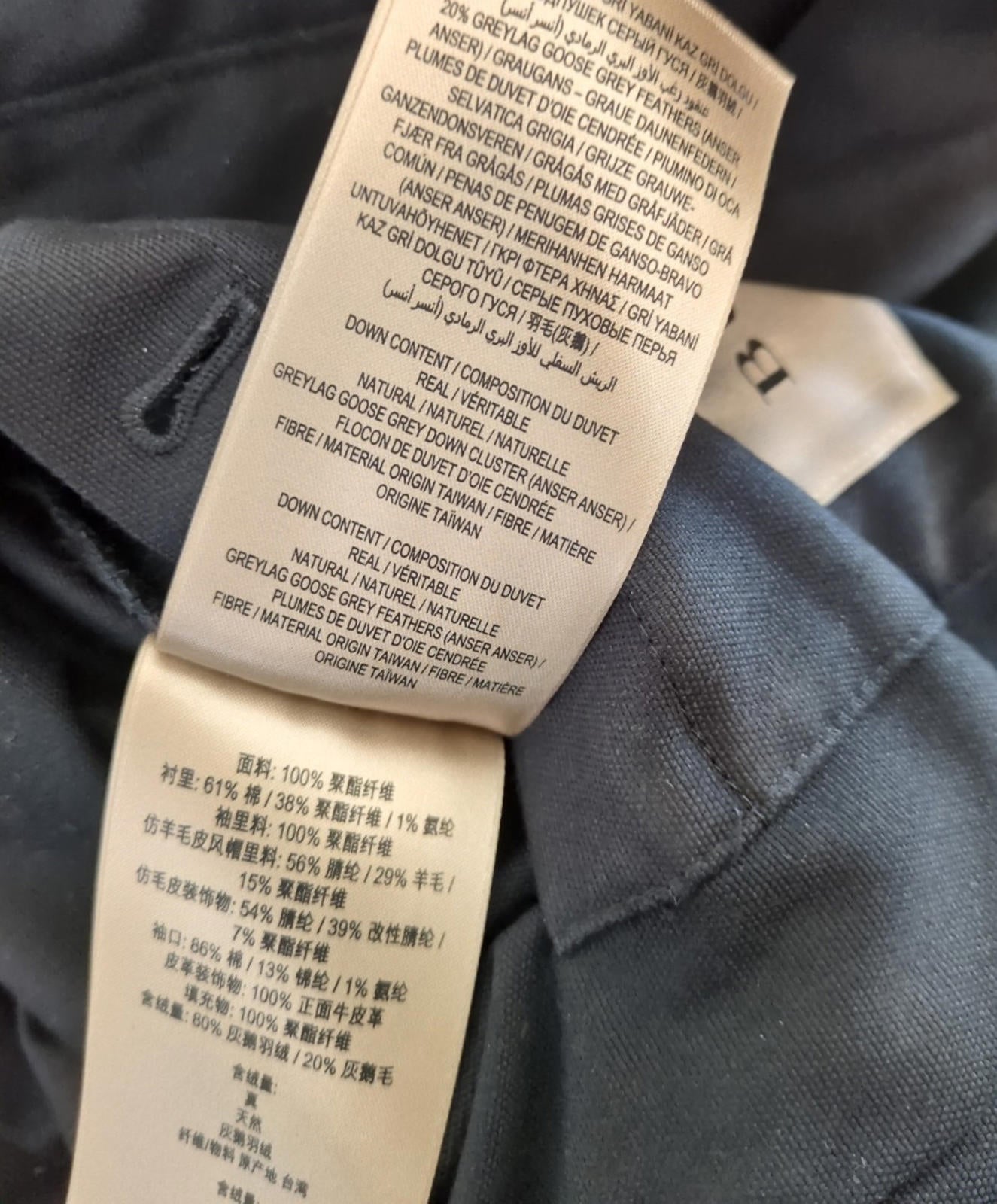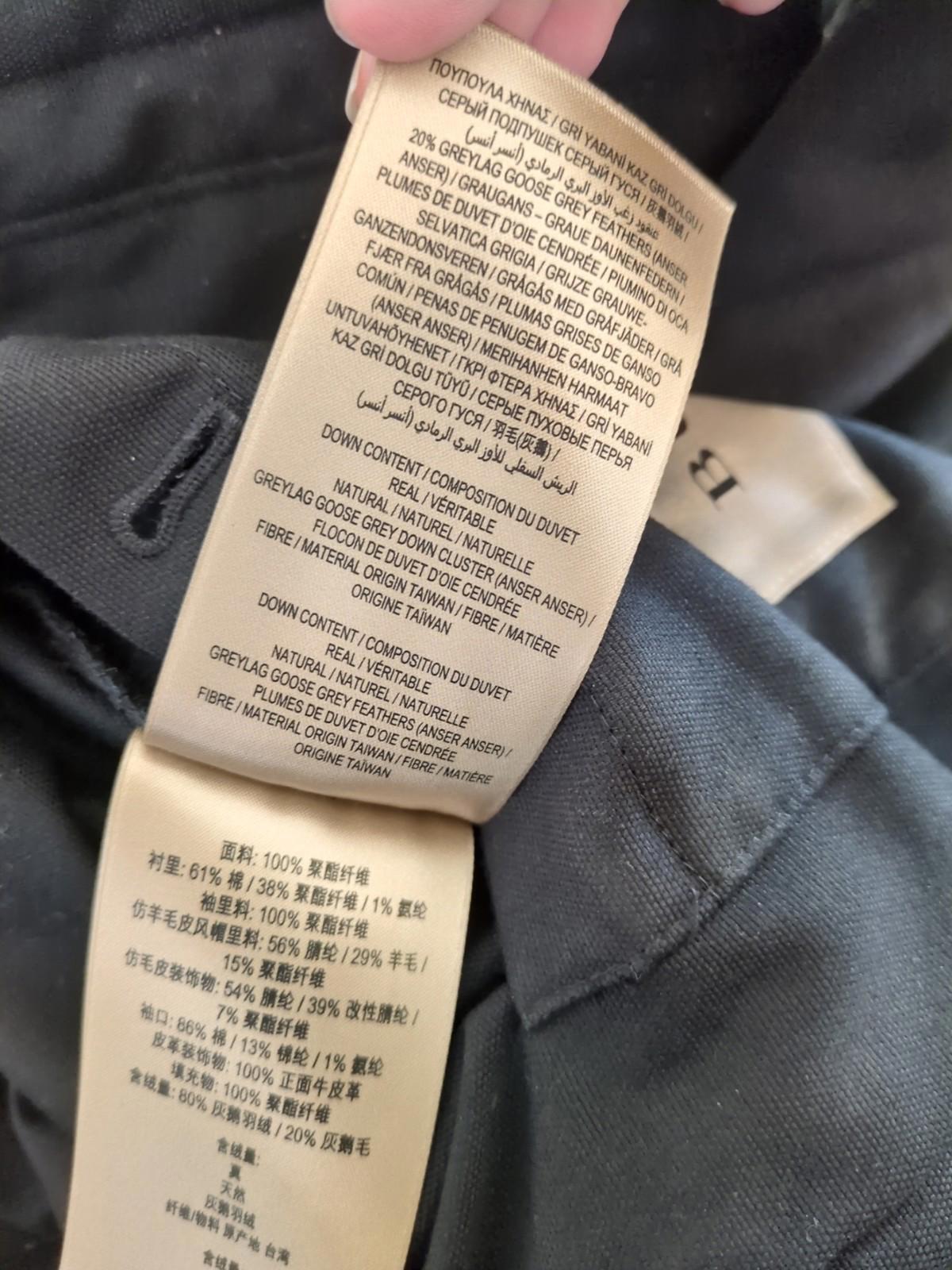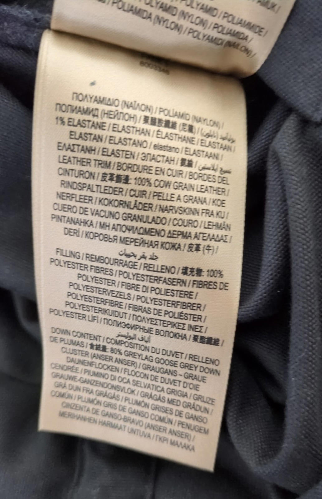 Composition - Polyamide. 80% Greylag Goose Down, 20% Goose Feather. Cow grain leather trim. Shearling Hood.