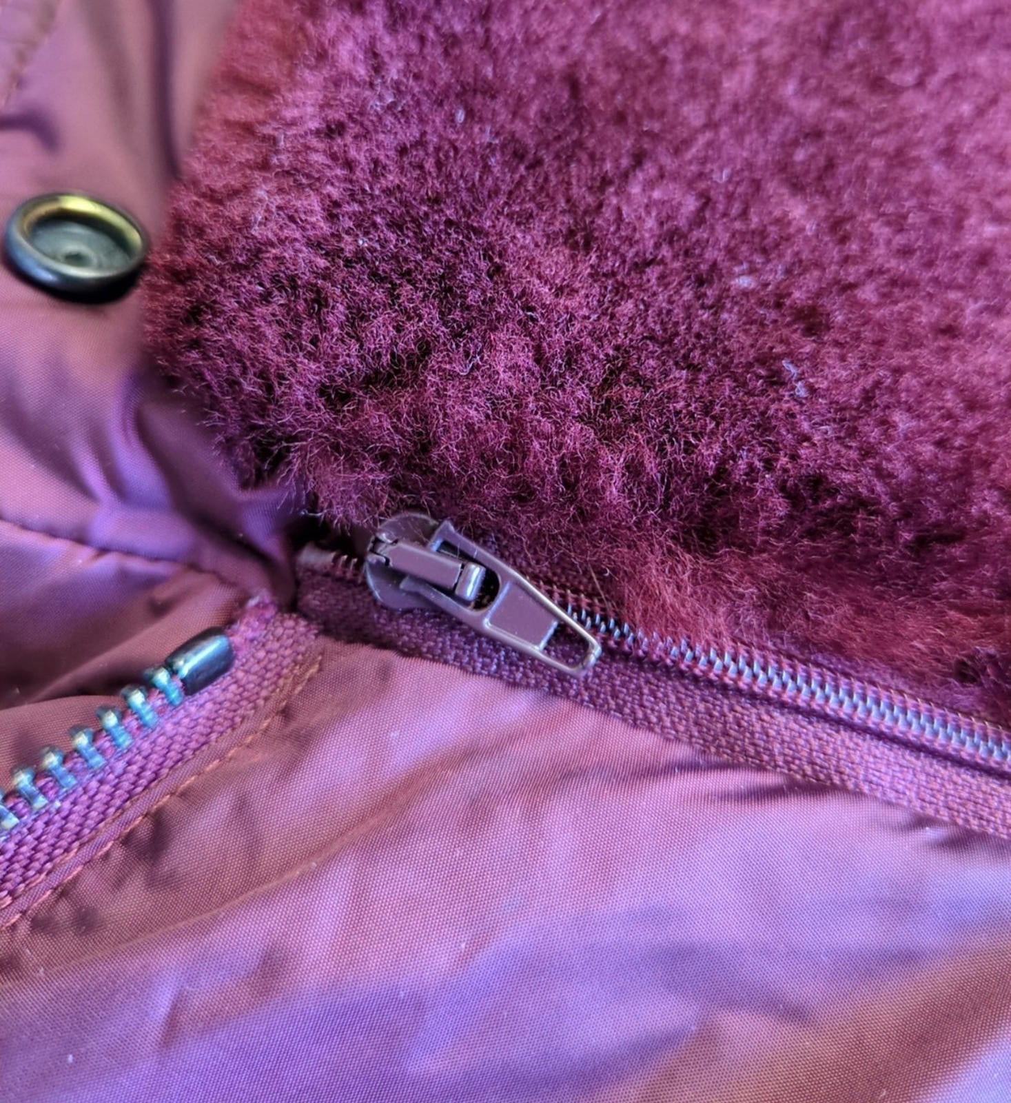This has been looked at for marks, stains, holes, rips, tears, lining issues, moth damage, colour transfer, non-functioning hardware, any other obvious signs of wear etc. It is in good overall condition. There is some discolouration to the ends of the sleeves.